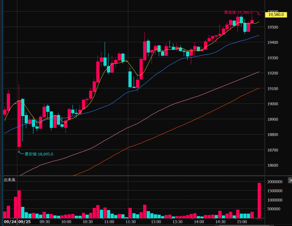 上昇を始めるとそこから15分間小さな陰線を二度つけるのみでほぼ上昇し続けていきました。そしていったんボックス相場を挟んだ後、14時ごろからはきれいな上昇トレンドを描いていき、極めつけは大引けで最高値19,580円をつけるという具合です。