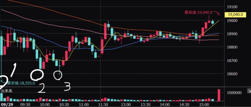 この下落トレンド時の最安値は18,590円。ここでもやっぱり5万円ほどの利益をゲットできたところでしたが、やっぱりもう少し下がることを期待して利確しませんでした。このときは2回目のときほどの根拠はなく、さすがに三回もこの18,600円付近のサポートライン下抜けにチャレンジしてるのだから三回目は抜けてくるでしょ。という根拠ではなく、もはやただの希望的観測でした。